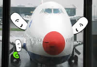 Das Flugzeug kommt. Das Landelicht ist eingeschaltet. Das Fahrwerk ist schon ausgefahren. Es fliegt auf die Rollbahn zu.